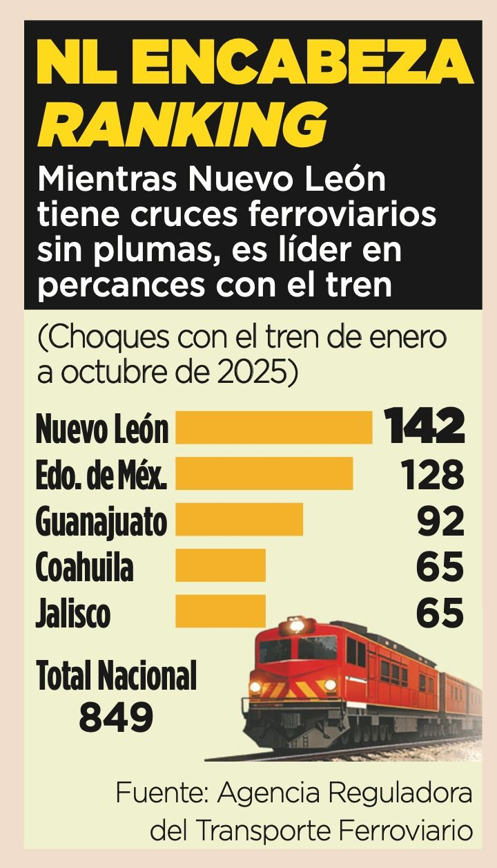 La seguridad vial en los cruces del área metropolitana atraviesa una etapa crítica actualmente. Nuevo León suma 142 accidentes ferroviarios entre enero y octubre de 2025, superando a cualquier otra entidad federativa. Esta cifra coloca al estado por encima del Estado de México, Guanajuato y Coahuila en las estadísticas de la autoridad federal. Los conductores enfrentan diariamente intersecciones que carecen de los elementos mínimos de protección para evitar colisiones con el ferrocarril.